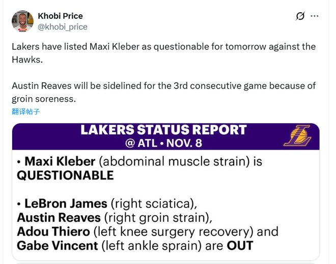北京时间11月8日,湖人官方更新明日对阵老鹰的伤病报告,里夫斯连续第三场比赛因腹股沟酸痛缺阵,同样缺席这场比赛的还有詹姆斯、蒂耶罗和文森特。克勒贝尔的状态是出战成疑。